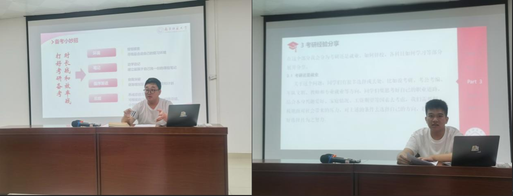 本次分享会特邀2025届优秀毕业生伍旸(考取华南师范大学研究生)和姚振森(考取广西大学研究生)担任主讲。伍旸从时间规划切入,结合大学各阶段可能面临的挑战,详细讲解了如何平衡学业与实践、高效利用课余时间、科学备战考研等内容,并强调了目标管理与执行力的重要性。姚振森则以心态调整为焦点,分享了备考期间调整情绪、应对压力的实用技巧,鼓励学弟学妹以积极心态面对考研这场“持久战”。